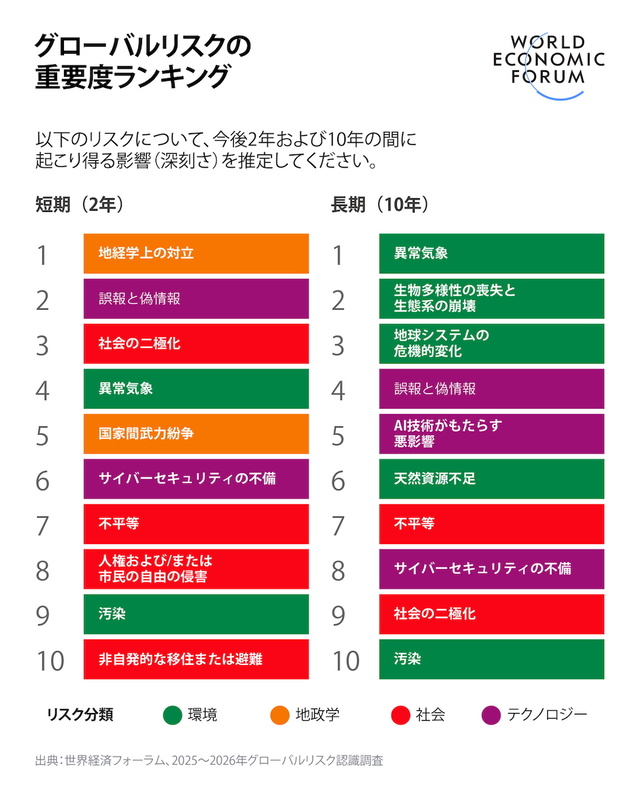 2026年の年次総会に先立ち公表された『グローバル・リスク報告書2026』では、短期的には異常気象よりも、地政学的・社会的分断が大きなリスクとして浮上した(図1)。
