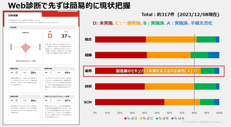 経産省は2022年に『工場システムにおけるサイバー・フィジカル・セキュリティ対策ガイドライン』を公開し、32項目のチェックリストを挙げている。同チェックリストに沿って現状を把握する。フォーティネットは、同チェックリストに基づいたWeb診断を無料で提供している(図2)。
