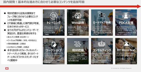 リスク低減を進めるためにフォーティネットは、「現状把握からリスクの正しい理解と計画、ソリューション導入、そして全拠点展開とサプライチェーンまでのOTセキュリティ戦略をワンストップで提供している」(小泉氏)という(図2)。