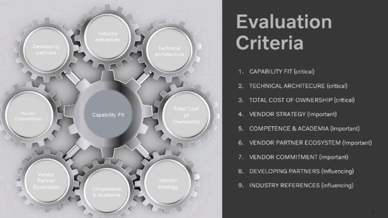 基準4=ベンダー戦略 :AI(人工知能)技術、未来の労働力、サステナビリティ(持続可能性)の3つの大きなトレンドに焦点を当て、ベンダーに直接、取り組みの全体戦略と方針説明を求めた