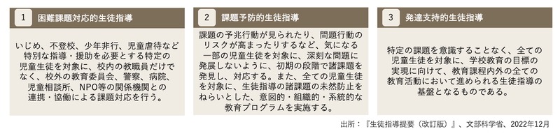 生徒指導は、困難課題対応的生徒指導、課題予防的生徒指導、発達支持的生徒指導の3つに分類される(図1)。