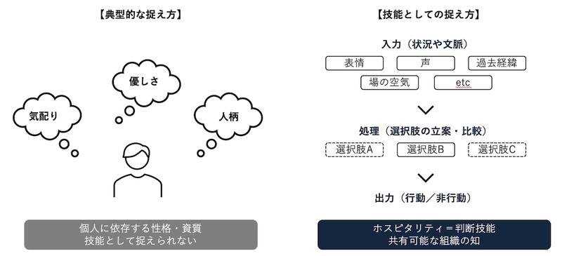 こうした状況下で、現場では「ホスピタリティ」や「おもてなし」といった言葉は、寄り添う姿勢や気配り、阿吽の呼吸といった要素と結び付けられ、「優しさ」や「人柄」「向いている・向いていない」といった個人の資質に依存するものとして語られてきた。結果として、教育や訓練によって身につける技能ではなく「あの人だからできる」で片付けられてしまう要因になってきた。