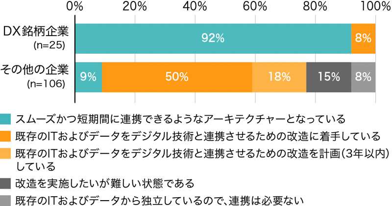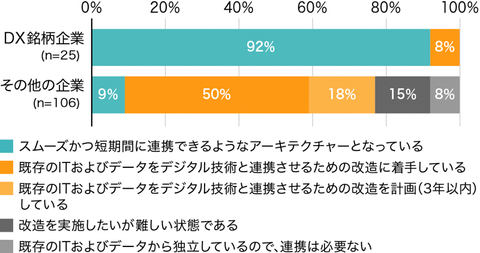 レガシーシステムのITモダナイゼーションがDXの大きな推進力になる可能性は高い。2024年5月にIPA(情報処理推進機構)と経産省が共同で公表した『デジタルトランスフォーメーション調査2024の分析』によれば、DXに意欲的に取り組み企業価値を高めている「DX銘柄」の認定企業の90%以上が、既存システムと新システムとの間でスムーズなデータ連携を実現している(図1)。
