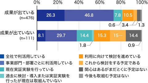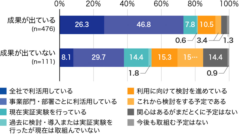 IPAが2024年にまとめた『DX動向2024』では、DXで成果を上げている企業では「全社で(データを)利活用している」あるいは「事業部門・部署ごとに(データを)利活用している」とする企業が70%を超えている(図2)。DXで成果を出せていない企業の回答比率と比較すれば、30ポイント以上高かった。