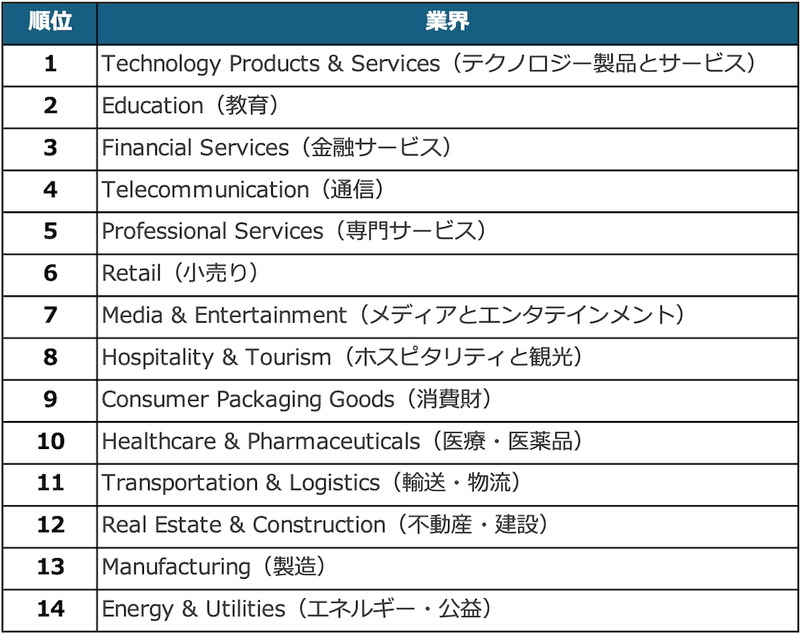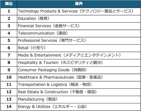 例えば2位のEducation(教育)、3位のFinancial Services(金融サービス)などは、従来はアナログな丁寧な応対が重要視されていました。それが真実かどうかはさておき、本質的には無形の情報のやり取りが価値を生む活動という側面は共通です。