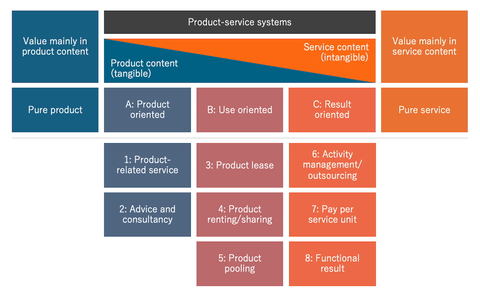 この形を統合的に説明しようという試みでは、産業生態学者のアーノルド・タッカー氏による2004年の論文『Eight types of product–service system: eight ways to sustainability? Experiences from SusProNet』が知られています。前回紹介した「サービスドミナント・ロジック」の発表と同じ年です。
