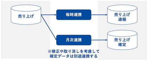 このとき重要になるのが、データ同期のタイミングと粒度です。リアルタイムに取得するか、日次や週次でまとめるかだけでなく、リアルタイムに流れるデータを速報値として扱い確定処理を経たデータを別途連携して利用するのかなどをあらかじめ設計しておく必要があります。例えば売り上げデータなら、速報値はリアルタイムでモニタリングし、確定処理を経たデータは月次の締め処理後に取り込むといった組み合わせも考えられます(図1)。