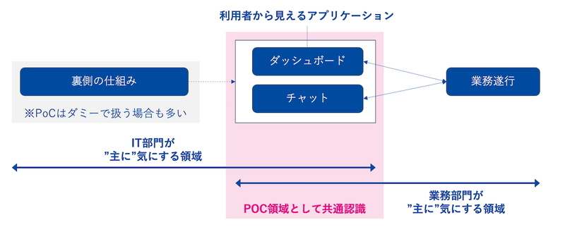 PoCを始めるとき一般には、業務部門もIT部門も同じ問いを持っています。「やりたいことは実現できそうか?」です。ただ、この問いに対して、業務部門とIT部門では違う意味で答えようとしていることがあります。実はPoCに対し業務部門とIT部門では、無意識のうちに異なる観点から状況を見ています。