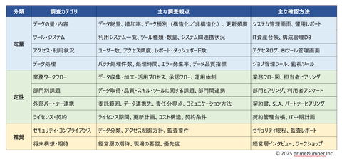 現状調査では何をゴールに設定すべきでしょうか。大きく(1)定量的に把握すべき項目と、(2)定性的に把握すべき項目とに分かれます(図1)。