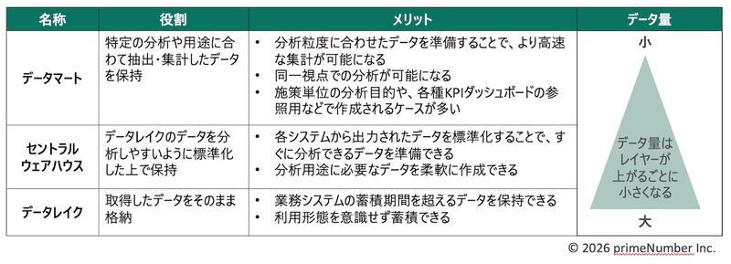 第3層=データマート :特定の分析や用途に合わせて抽出・集計したデータを格納する。データ量の増加や、さまざまな目的に柔軟に対応できるようになる