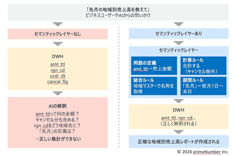 AI機能がデータの意味を正しく理解し、適切な集計・加工処理を実行するためには、セマンティックレイヤーを用意し、データを定義付け、ビジネス用語との対応関係を整備しておく必要があります。