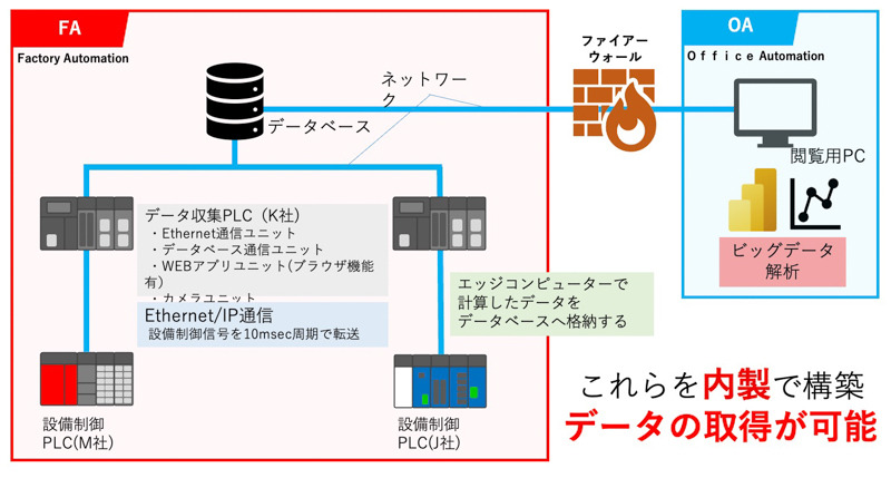 製造部門では当初、設備機器の故障や動作不良を、それらが起きる前に検知する予兆検知システムに取り組んだ。設備機器のPLC(Programmable Logic Controller:産業用コントローラー)のデータをエッジコンピューターで吸い上げたデータを監視することで、異常値を検出し必要な対策を取れるようにした。