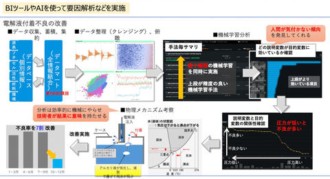 例えば、電池ケースに電解液が付着する不良原因の究明では「短期間に不良の7割を改善できた」(志村氏)という。その際は、材料や環境など約5000項目のデータを集約し、データを前処理してからBIツールで可視化・確認。その後に、数十種類の機械学習手法を同時に適用し影響がありそうな事象を抽出し、その物理メカニズムを人が考察し対策を練るというアプローチを適用した(図4)。