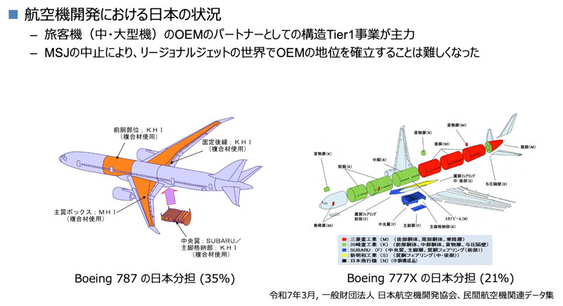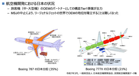 さらに深刻なのは「パートナーの立場でも、日本のシェアの低下が危惧される」(神田氏)ことだ。例えば「ボーイング787」での日本の生産分担率は35%、最新の「ボーイング777X」では21%である(図1)。コロナ禍によるサプライチェーンの見直しで内製化が進み、世界各地でTier1企業が台頭する中、日本は厳しい競争にさらされている。神田氏は「構造Tier1としての立ち位置が続くとシェアが下がる可能性があり、非常にまずい状態にある」と警鐘を鳴らす。