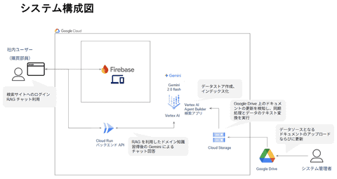 現時点でKDDIが利用している回答用の「生成AIアシスタント」の構成は図1のようになっている。生成AI技術には「Gemini」(米Google製)を採用し、社内文書やベテラン社員の知見を学習。そのうえで外部連携するクラウドストレージから新たな学習データを取り込み、RAG(Retrieval-Augmented Generation:検索拡張生成)技術を使って生成AIアシスタントが文脈に沿って回答を生成する。