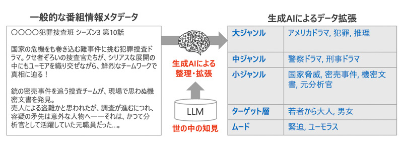 既存の番組データをLLM(Large Language Model:大規模言語モデル)に入力すれば、AI技術が番組の文脈を理解し補足情報を生成する(図2)。「番組の制作背景や、スタッフや出演者のエピソード、海外での反響など、人手では調べきれない付加情報を自動生成できる。「これまで番組のメタデータは、番組表に載った内容や出演者、ジャンル、あらすじなどの定型情報が主だった」(鎌田氏)という。