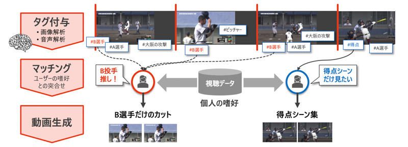 もう1つのAI活用例が「パーソナライズド動画自動生成」だ。視聴者1人ひとりの嗜好や視聴履歴に合わせて、番組を自動で再構成する(図3)。具体的には、番組の映像を解析し、登場人物や展開ごとにシーンを分類しタグ化する。これを視聴データと組み合わせることで、視聴者が見たい部分だけを自動で抽出する。例えば「特定のチームの試合だけをまとめたスポーツダイジェストや、好きな俳優の登場シーンを集めたドラマの再編集などが可能になる」(鎌田氏)という。