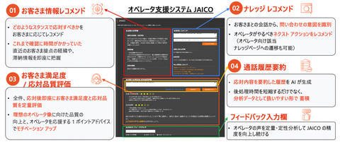 これらに応対するオペレーターを対象に、オペレーター支援システム「JAICO」を自社開発した(図4)。顧客との通話内容をリアルタイムで文字起こしし、その要点を生成AI技術で自動要約・記録する。