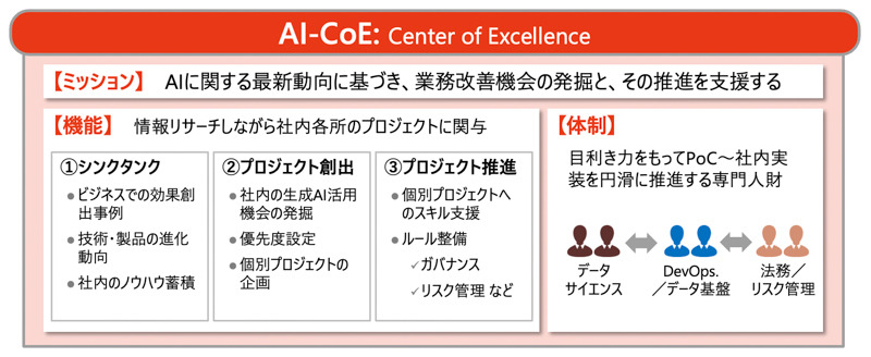 この方針転換を具現化する中核組織として、社内横断の専門組織「AI-CoE(Center of Excellence)」を設立した(図1)。データサイエンスや情報システム、法務・リスク管理など複数の部門からメンバーを集め「AI技術の最新動向の調査から技術支援、プロジェクトの伴走まで幅広く担っている」と鎌田氏は話す。
