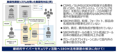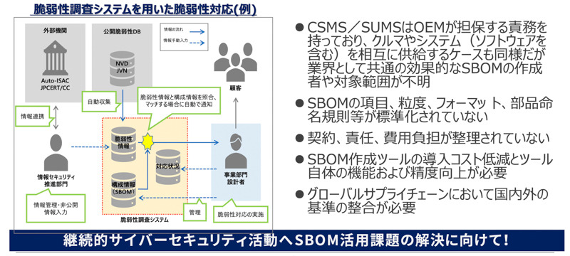 脆弱性情報とSBOMを突き合わせることで、対象ソフトウェアの影響範囲の特定にかかる工数を削減し、インシデント(事故)発生時の対応を早められる。従来は各サプライヤーに問い合わせていた照合作業の効率を高められるため「自動車業界でも大きな注目が集まっている」と山﨑氏は話す。
