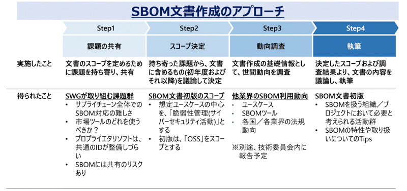 2023年にはSBOMワーキンググループを立ち上げた。Step1:課題の共有、Step2:スコープ決定、Step3:動向調査、Step4:文書執筆という段階的アプローチで活動を進めてきた(図4)。2025年8月には活動の成果物として『クルマのサイバーセキュリティにおけるSBOM活用』の初版を会員企業向けにリリース。「年度末の一般公開を目指して手続きを進めている」(山﨑氏)という。