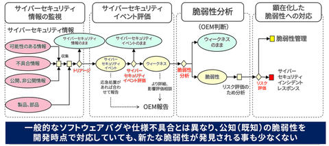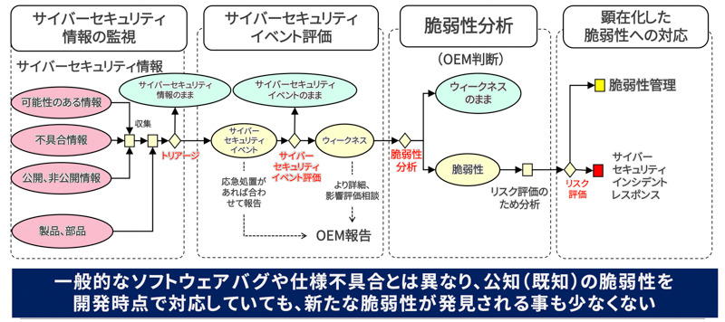 中でも「(2)イベント評価の段階で『今は問題ない」と判断した情報の扱いには注意が必要だ」と山﨑氏は指摘する。将来、新たな脅威になる可能性があるため「次期車種への反映やランニングチェンジ(現行モデルの改良)、長期間管理といった形で継続的に対応し続ける必要がある」(同)からだ。