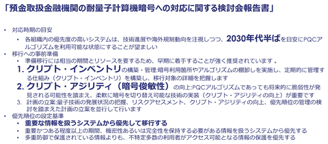 同報告書は、2030年代半ばを目安にPQCを利用可能な状態にすることを推奨し、それに向けて不可欠な事前準備として次の2点の確立を求めている。