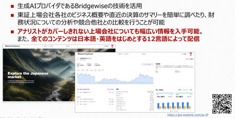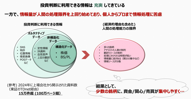 こうした現状を三村氏は「多くの銘柄がある中で、アナリストの数は限られ、翻訳リソースにも制約がある。処理にかけられる時間は短く、情報量には波があり、開示が集中する時期もある。情報ソースも分散している。生産年齢人口の減少もあり、人間の処理能力はこれ以上伸びない」とみる。