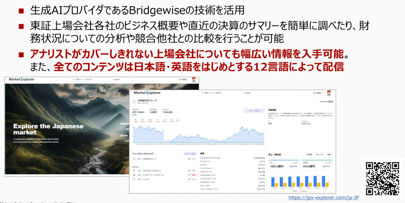 現在、東証には約4000社が上場している。だが三村氏は「その多くが十分に注目を集められていない」と指摘する。同時に「この課題を別の角度から捉えれば『調べられないから投資されない』という流れを逆回転できれば全社に光が当てられる」(同)ともいう。そのためのブレークスルーとしてJPX総研が着目したのが生成AI技術の活用である。