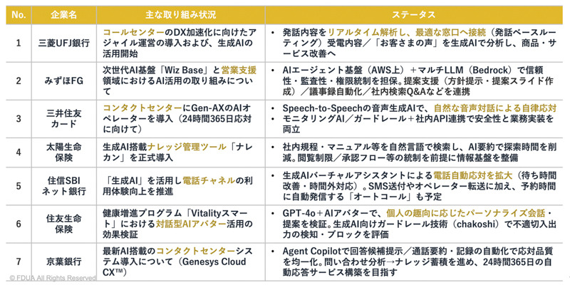 その象徴的な領域がコンタクトセンターだ。「多くの金融機関が、生成AI技術を活用した問い合わせ対応の高度化や自動化を進めている」と岡田氏は話す(図3)。音声認識と生成AIの両技術を組み合わせて顧客の発話内容をリアルタイムに解析し、最適な窓口へ誘導したり、オペレーターに最適な回答候補を提示したりといった取り組みが「実装段階に入っている」(同)とする。