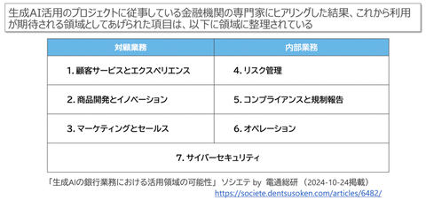 (6)オペレーション :三菱信託銀行は社内の問い合わせ用途に利用する。専用アルゴリズムをスタートアップのカサナレが開発し、システム仕様書や業務マニュアル、FAQ(よくある質問と答)を学習させた。実証実験では、専門的な金融知識が求められる問い合わせに対する正答率が90%を超えた。2024年4月からは業務に利用し、担当部署の対応時間を50%削減したという。他領域に広げれば年間数十万時間以上の効率化が図れると試算する。