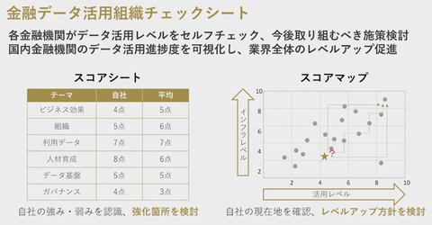 FDUAが策定する標準化の1つに「金融データ活用組織チェックシート」がある(図1)。利用データ、組織、データ基盤、人材育成、ガバナンス、ビジネス効果の6テーマそれぞれについて10の質問に答えれば、データ活用の成熟度が可視化される。金融機関はデータ活用レベルを自己評価できる。