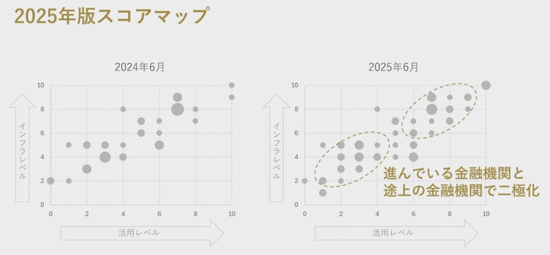 金融データ活用組織チェックシートの利用状況に関する2025年版の調査結果によれば「全体としてスコアは前年より向上しており高スコアの金融機関が増えている」(中村氏)。ただ「その伸びは一様ではなく、2極化の傾向が強まっている。戦略やトップコミットメントが明確な企業が着実にスコアを伸ばしているのに対し、体制整備や人材育成が追いついていない企業では停滞が見られた」(同)という(図2)。