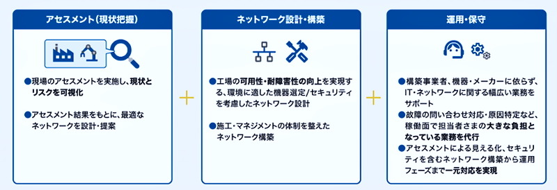 運用・保守では、故障時の問い合わせ対応や原因特定などの業務を代行するほか、サポートが終了した基本ソフトウェア(OS)や工場固有の脆弱性に対応したセキュリティ対策を提供する。他の事業者が構築したネットワークやIT環境、種々のメーカー製の機器にも対応する。