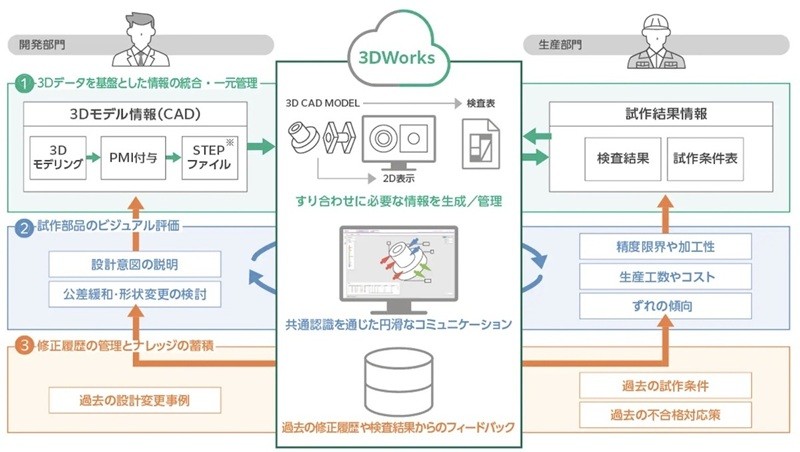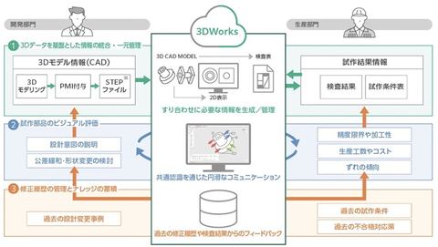 3DWorksは、開発部門が作成した3DモデルをPMI(製品製造情報)と共に取り込んで一元管理する。そこから生産現場向けの2D(2次元)図や、測定指示付きの検査表を自動で生成し、生産部門とも共有する。生産部門は3Dモデルに対し、検査表に入力した検査結果や不具合対応履歴を登録でき、開発部門に伝えられる。