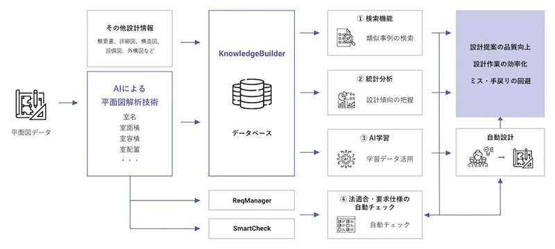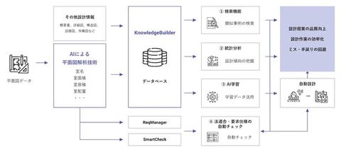 平面図解析技術は、同社の建築設計用基盤「Tektome Platform」の1機能として提供する(図2)。抽出したデータは同社のナレッジ管理ツール「KnowledgeBuilder」で管理し、設計事例の検索や設計傾向の把握、自動設計などを可能にする。建築設計要件管理ツール「ReqManager」や建築設計要件確認ツール「SmartCheck」を使えば、法制度や要求仕様への適合を確認できるという。これらにより、設計計画の効率化や統計データに基づく意思決定、設計レビューの省力化、積算の自動化などにつなげたい考えだ。