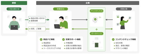商品ナビ機能は、商品に対する概要やQ&A集、営業トークのスクリプトを作成する。営業サポート機能では、市場調査や、提案に向けた顧客課題の抽出や商品の比較表を作成する。
