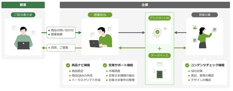 自社での実証実験の結果をもとに、同社が保有する生成AIユースケースと、生成AIサービス「Azure OpenAI Service」(米Microsoft製)を組み合わせて営業向けアシスタントAIを開発した。