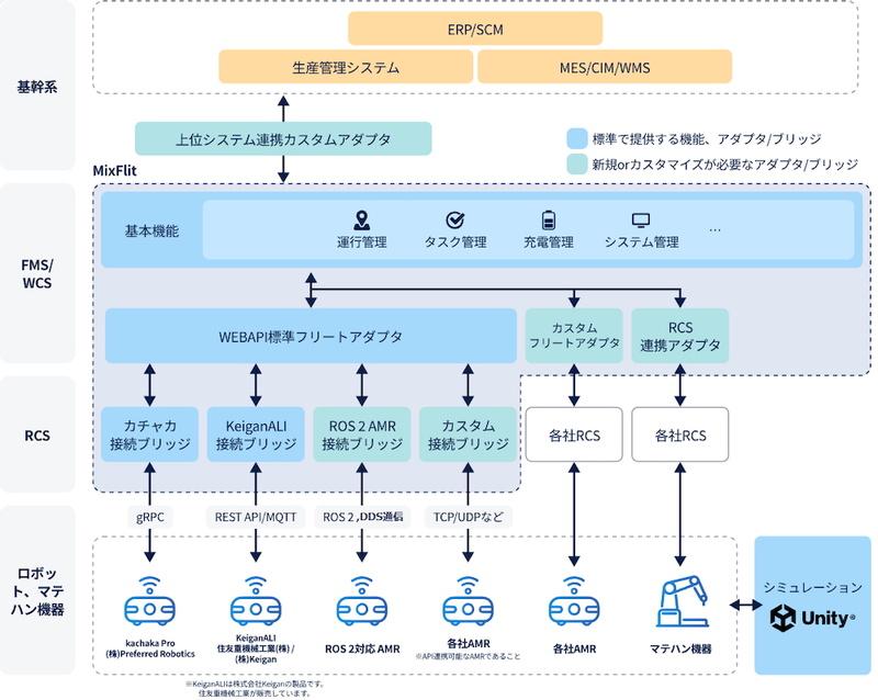 制御できるAMRは現時点では「Kachaka pro」(Preferred Robotics製)と「KeiganALI」(Keigan製)の2機種。順次拡大するとしている。加えて、複数フロアへの対応や国際標準通信規格「OPC-UA連携」に対応する予定だ。