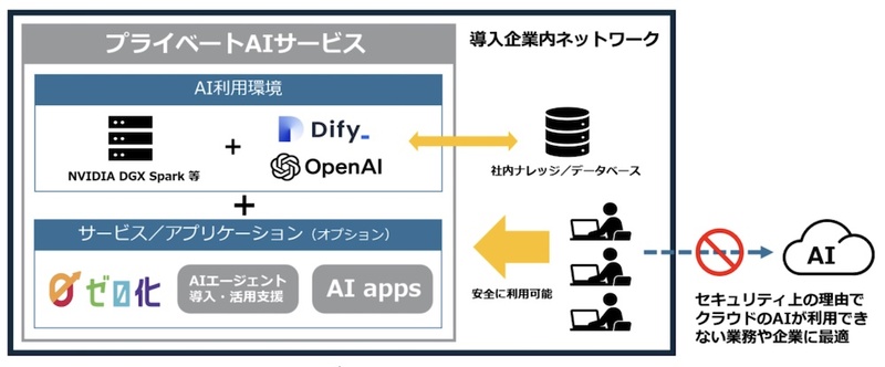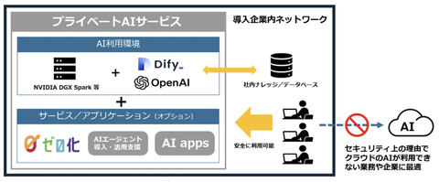 AIアプリの開発・実行環境としては、デスクトップ型のAI処理用コンピューター「NVIDIA DGX Spark」(米NVIDIA製)を利用し、利用企業の社内ネットワークに接続する。DGX Sparkに、オープンソースのLLM(Large Language Models:大規模言語モデル)やAIアプリの開発環境「Dify」(米LangGenius製)などを導入し利用する。