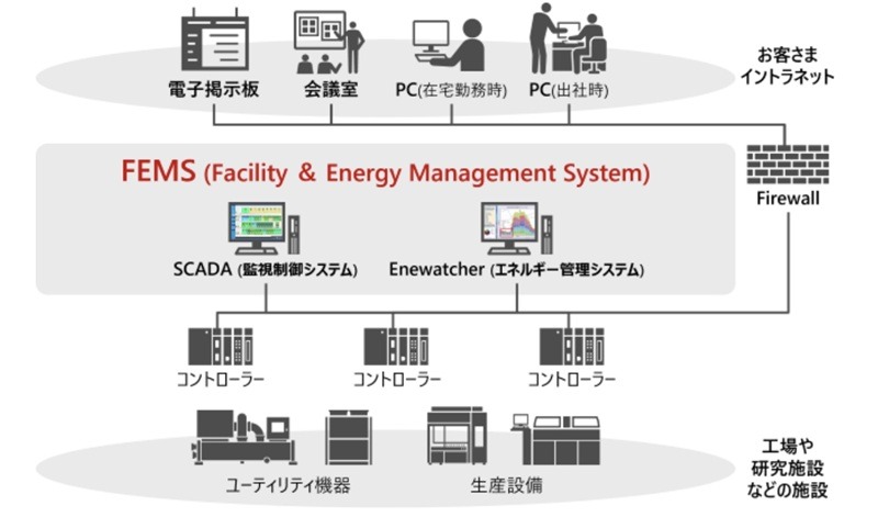 FEMSは設備運用の支援策として、設備や機器の監視、起動・停止、設定変更、定型フォームによる報告書作成、データ管理、エネルギー管理などの機能を提供する。同社の消費エネルギーを原単位で可視化する「Enewatcher」とSCADA(Supervisory Control and Data Acquisition:監視制御システム)で構成される(図3)。
