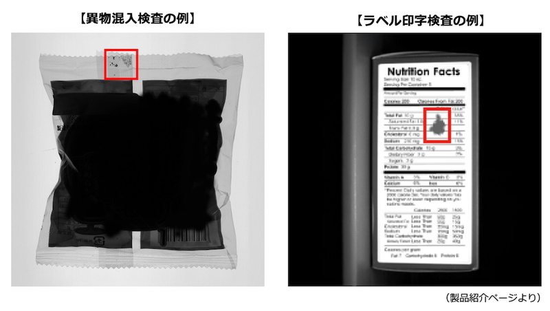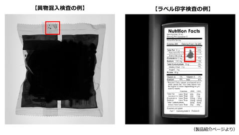画像認識技術による外観検査では、袋やパウチ、トレイ包装などの包装形態や、包装不良や異物混入、形状不良、商品欠け・破損などに対応する(図2)。そのための学習データとしては、少量の良品画像で良いとする。大量の不良画像を集めなくて良く、短期間・低負担で導入できるという。運用後には、良品や不良品のアノテーションデータを追加学習することで、見逃し抑制と過検出防止の精度を改善できる。