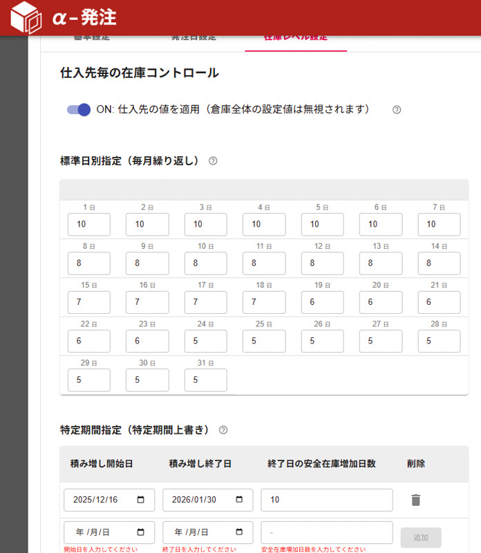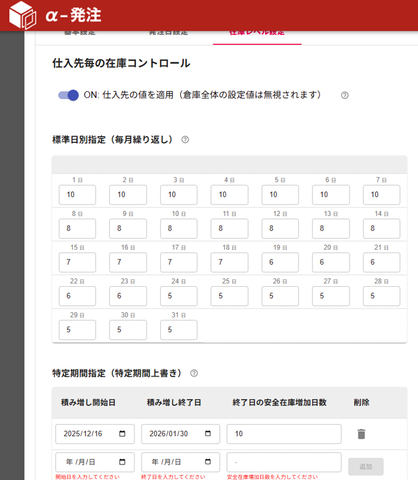 α-発注では自動発注量を算出する際に「安全在庫増加日数」というパラメーターにより、予測販売数に対して何日分の在庫を増減するかを設定できる。新機能ではこれを、倉庫全体ではなく、仕入れ先ごとに設定できるようにした。日ごとに設定する標準日別と、標準日別の設定を一時的に上書きする特定期間とで設定できる(図1)。
