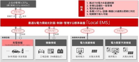 Local EMSは拠点ごとに設置するエネルギー管理の基盤である。各種設備やEV(Electric Vehicle:電気自動車)充電器・充放電器などを管理し稼働状況を示すデータを取得する。そのデータを使った需要予測などに基づき、各種設備を制御する。