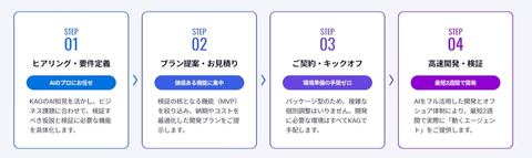 AIエージェントを開発するために、AI技術を使った開発の知見とオフショア開発を組み合わせて提供する「KAGオフショアAIラボ」を立ち上げた。 PoCに利用する最低限の機能を持つAIエージェントを最短2週間で開発・納品できるとする。納品から1カ月間の保守運用サービスも提供する。オフショア開発では、ベトナムFPTの日本法人であるFPTジャパンホールディングスと2014年から連携している。