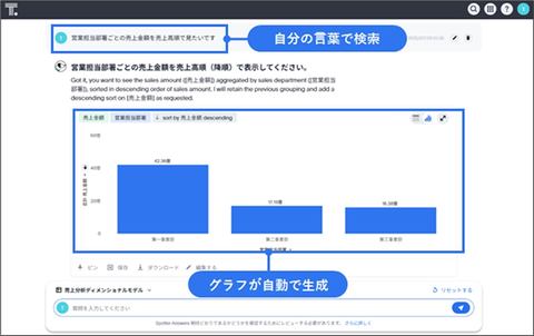 IIJ(インターネットイニシアティブ)が販売する「ThoughtSpot」(米ThoughtSpot製)は、自然言語で操作できるBI(Business Intelligence)ツール。ダッシュボードを作成することなく、自然言語で質問すると必要なデータをグラフにし表示する(図1)。同社が提供するデータ連携基盤「IIJクラウドデータプラットフォームサービス」の可視化ツールに位置付け、社内のデータ基盤やクラウド上にあるデータを対象に、横断的なデータ分析が可能になるとする。