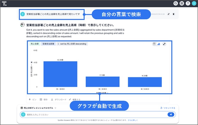 ThoughtSpotは、AI(人工知能)エージェントの機能も持ち、自然言語での質問や相談内容に応じて「何を分析すべきか」を提案したり、数値の変動要因を分析したりができる。