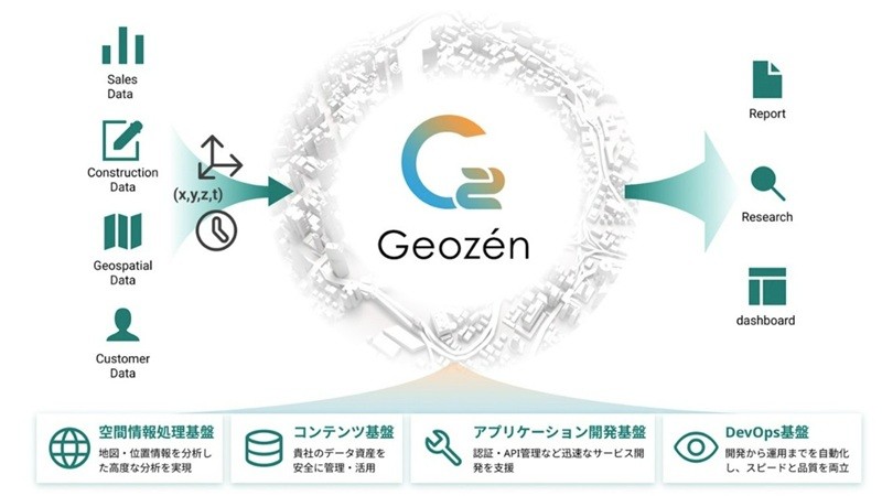 Geozénは(1)空間情報処理、(2)コンテンツ、(3)アプリケーション開発、(4)DevOpsの4つの基盤で構成することで、必要な機能を選ぶ形でのアプリケーション開発を可能にする。LLM(Large Language Model:大規模言語モデル)が理解・学習しやすい設計により、AI(人工知能)技術の利用が容易になるとしている。