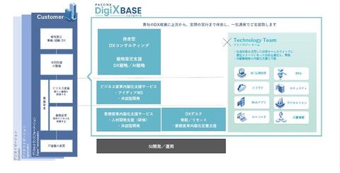 パソナの「PASONA DigiXBASE」は、企業がDX(デジタルトランスフォーメーション)に取り組むための戦略の策定から実行、システム構築までを支援するサービス(図1)。必要な人材を育成しながら、AI(人工知能)技術を使ったシステム開発による内製化なども支援し、企業自身でDXを推進できる体制の構築につなげられるとする。