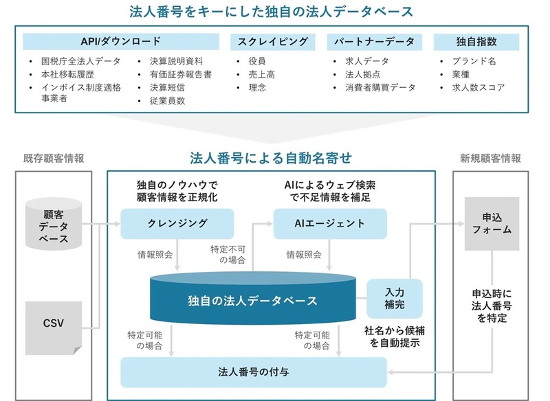DataLincではまず、国税庁の法人番号などを一意のIDとして付与することで、社内データを名寄せする(図1)。AI(人工知能)エージェントを使って社外Webから必要な情報を検索して補完したり、ロジック外のデータ欠損や誤表記を修正したりする。AIエージェントが特定できない場合には、社名から手入力するための候補を提示する。